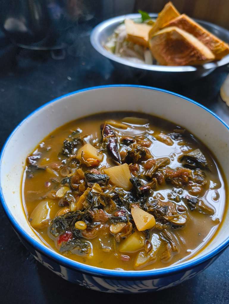 Gundruk soup, or gundruk ko jhol, as it is locally known, is likely the more popular version of the two. It is the epitome of comfort food, and can be served just as it is with some steamed rice, or with a side of sabzi and a generous dollop of tamatar ko achar. To prepare it, a handful of gundruk is first allowed to rehydrate in some hot water and is cooked in a pressure cooker, usually with some onions, potatoes, ginger, garlic, and the soaking liquid. The recipe does vary according to different households. For instance, my mother adds onions to her gundruk ko jhol but my aunt does not. Some people add roasted whole soybeans to the soup while others can do without it. However, everyone agrees that a bowl of piping hot gundruk ko jhol is just the cure for a runny nose or a bout of indigestion. Indeed, gundruk is a great source of vitamins and minerals, especially vitamin c, iron and calcium which are preserved during the fermentation process (Panchal et al, 2024). It also possesses anti-microbial properties and is a great probiotic (Tamang and Tamang, 2009).