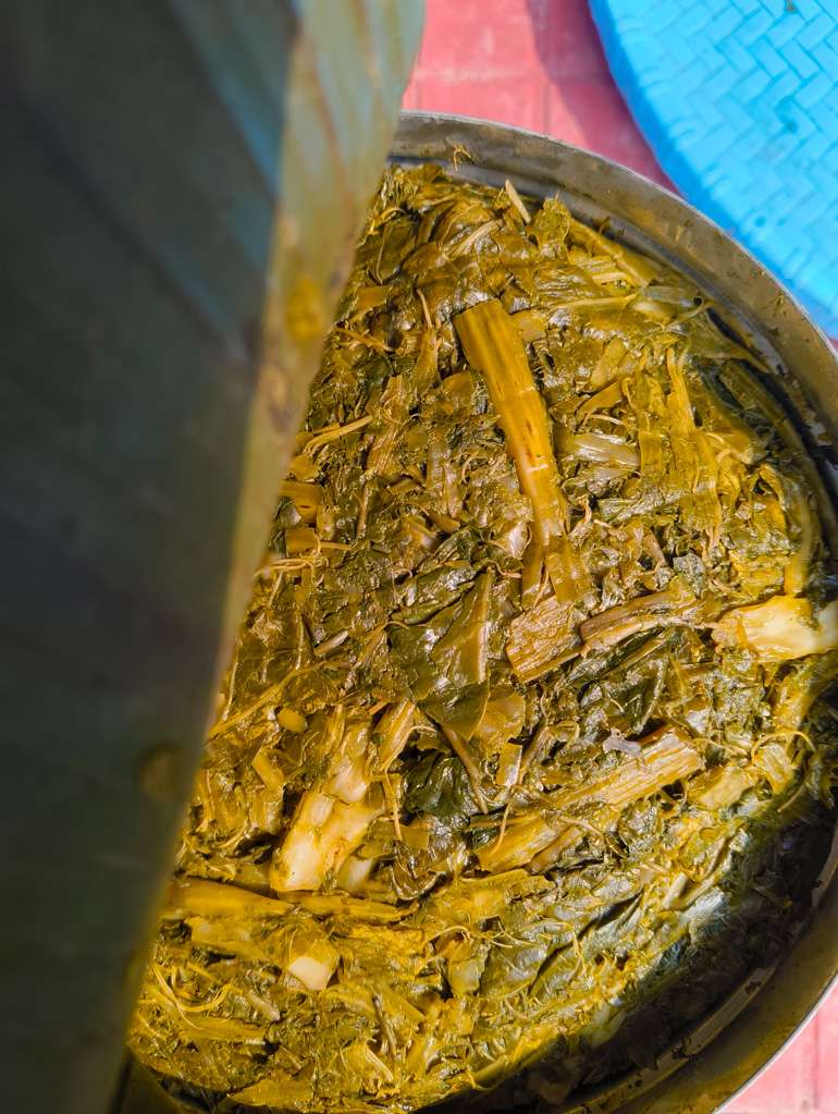 Towards the end of the fermentation process, the bright green leaves turn into a dull olive, and the container emits a mouth puckeringly sour aroma. At this stage, my mother usually does a taste test – if it is too sour, she gives it a quick rinse; if not, the leaves are fermented further for a day or two. When sufficiently sour, they are sun-dried on flat bamboo trays called nanglo, after which they are tightly packed and stored in a cool, dry place for future use.
